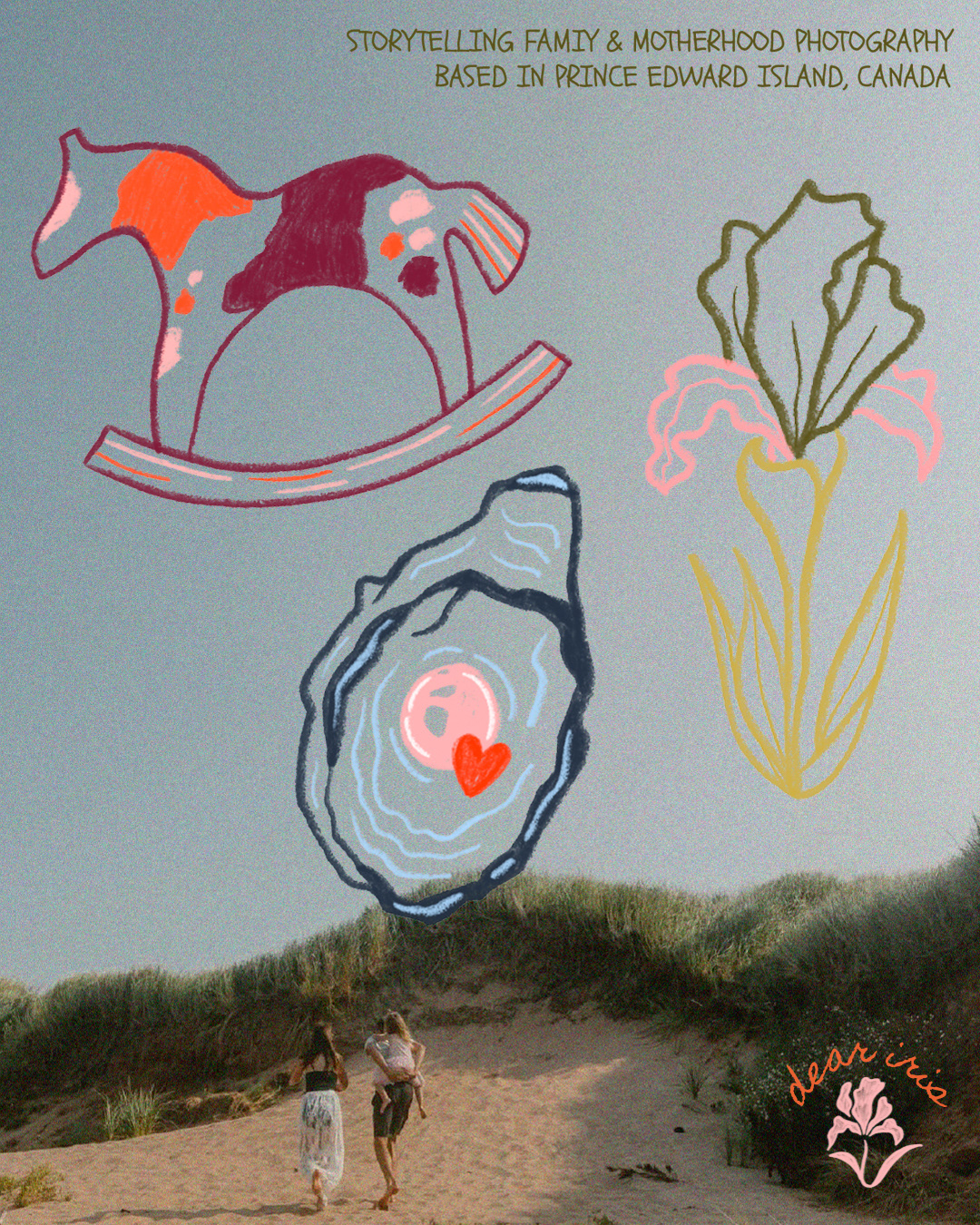 Nouvelle identité visuelle pour Dear Iris; un studio de photos de famille et maternité où les séances sont réalisées à travers le jeu, la spontanéité et l’inclusion.